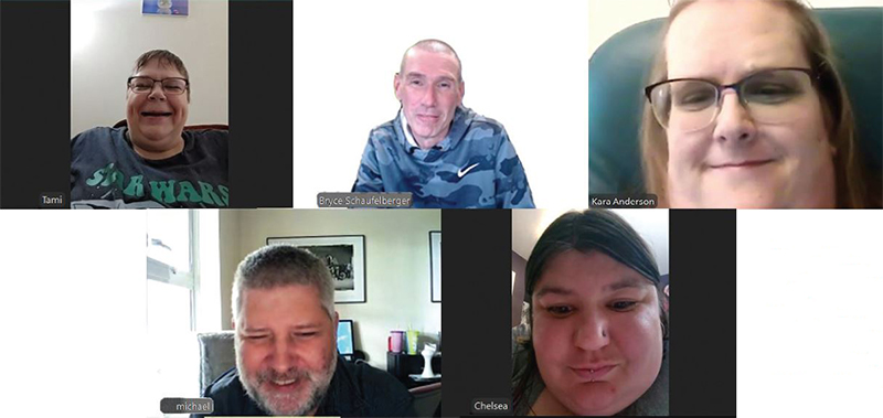 clockwise from top left: Editorial Team Members Tami Pedersen (Kamloops), Bryce Schaufelberger (Mission), Kara Anderson (Nanaimo), Chelsea Rinquinha (Kitimat) and Michael McLellan (Burnaby) connect from across the province to plan and create the Celebrate Diverse Abilities magazine.
