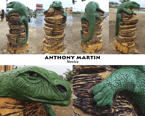 Martin entered the novice category. Originally, he had planned on doing an alligator but decided to do a smaller piece for his first competition, a lizard. In preparation of his design, he researched reptiles in a local bookstore, keeping his plans in his head, not on paper. With his tool bag in hand, and machine oil, paint and a piece of yellow cedar provided by the competition, he was ready for the contest.