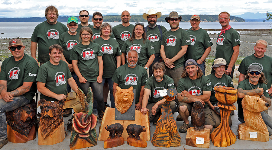Anthony (back row, far left) and fellow carvers worked side-by-side on their creations over three full days at the 2019 Campbell River Shoreline Arts Chainsaw Competition (photo courtesy of the Campbell River Shoreline Arts Society).