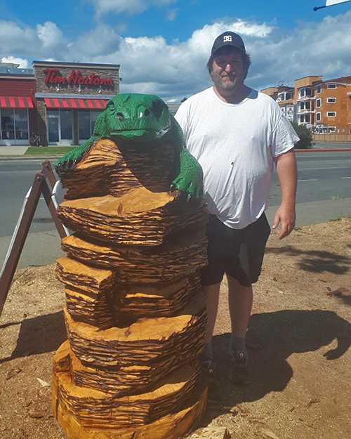Anthony Martin displays the lizard sculpture that he carved at the Campbell River Shoreline Arts Chainsaw Competition.