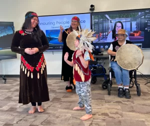 Esquimalt Chief Thomas opened the day with a Welcoming, followed by Songhees Elder Diane Sam with a grounding ceremony. View Royal Mayor Sid Tobias then spoke about ongoing work and collaboration in the region, setting the stage for a shared celebration with the Songhees dancers and the Victoria staff team. The celebration was acknowledged amongst colleagues, Indigenous Advisory Committee members and CLBC leadership.