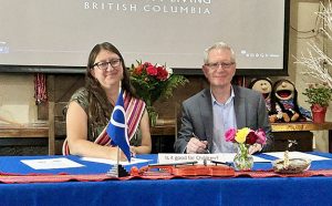 Nicole Semenoff, President, Board of Directors, Lii Michif Otipemisiwak Family and Community Services, and Ross Chilton, CLBC CEO, sign a formal Collaboration Agreement.